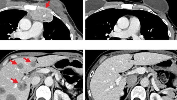 Después de recibir la inmunoterapia, los tumores se redujeron por completo y 5 años después los escaneos muestra que está libre de cáncer.